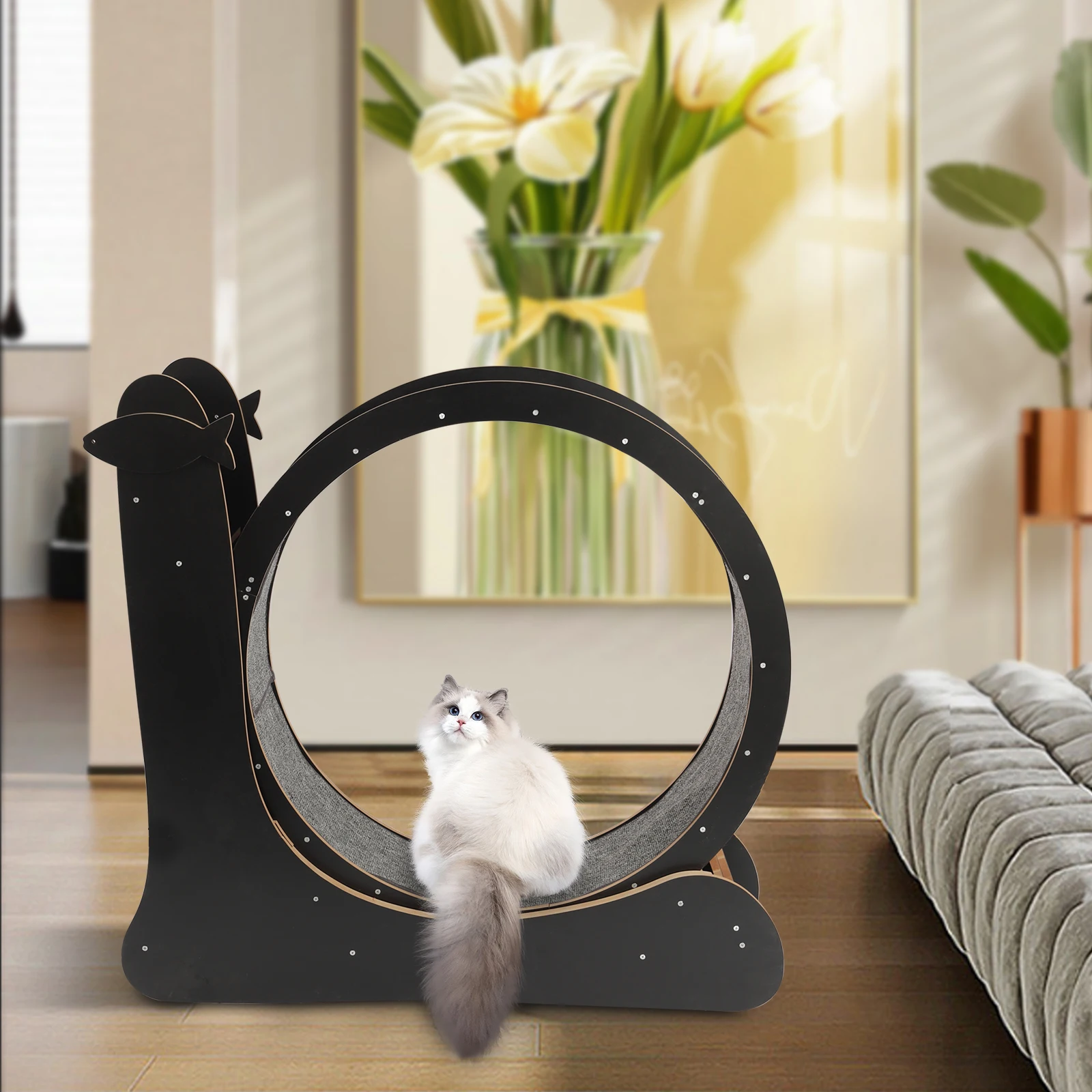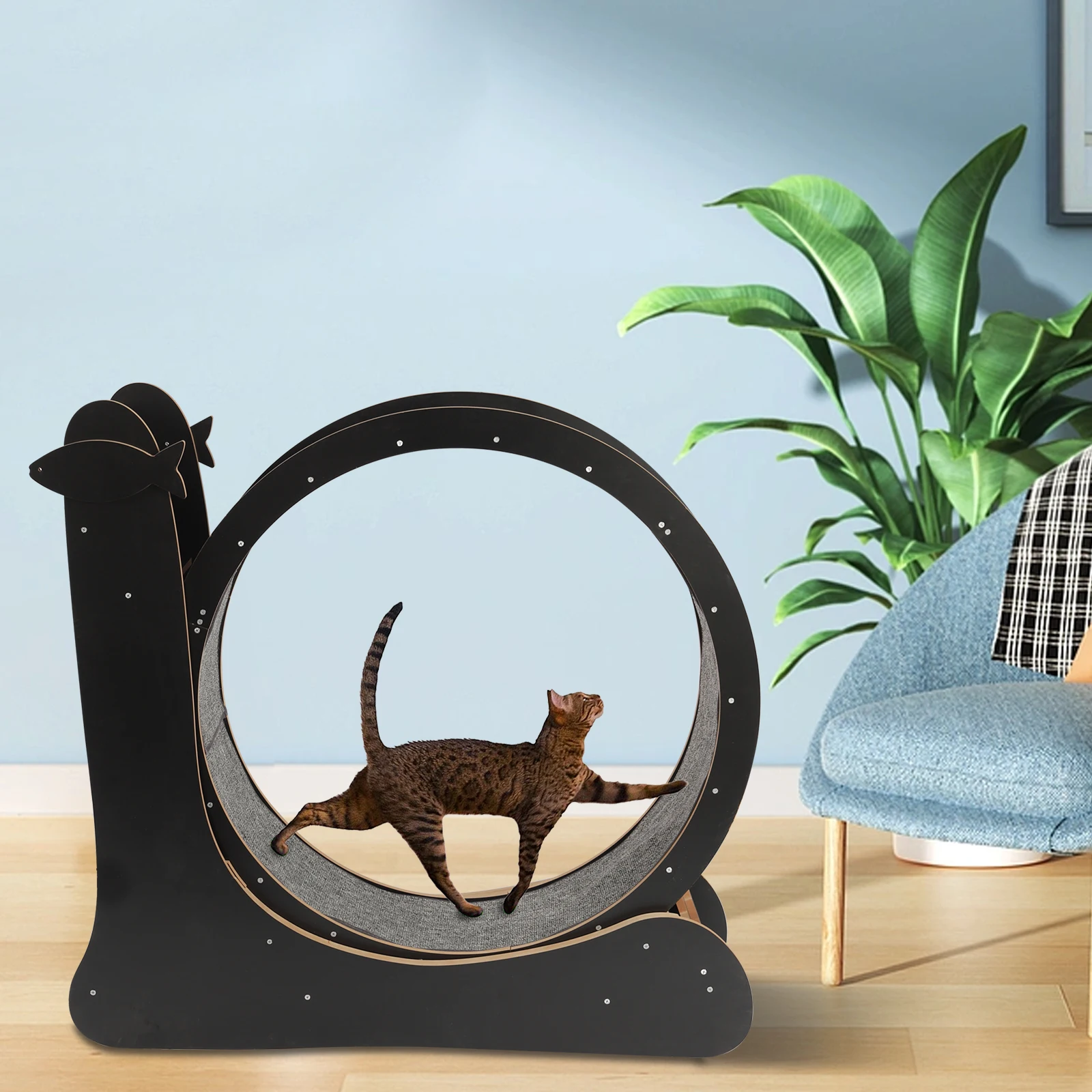 Fish-shaped Decoration: This cat treadmill has two fish-shaped decorations, and its safety latch device is also fish-shaped, which conforms to the cat's preference and adds loveliness to the whole item .