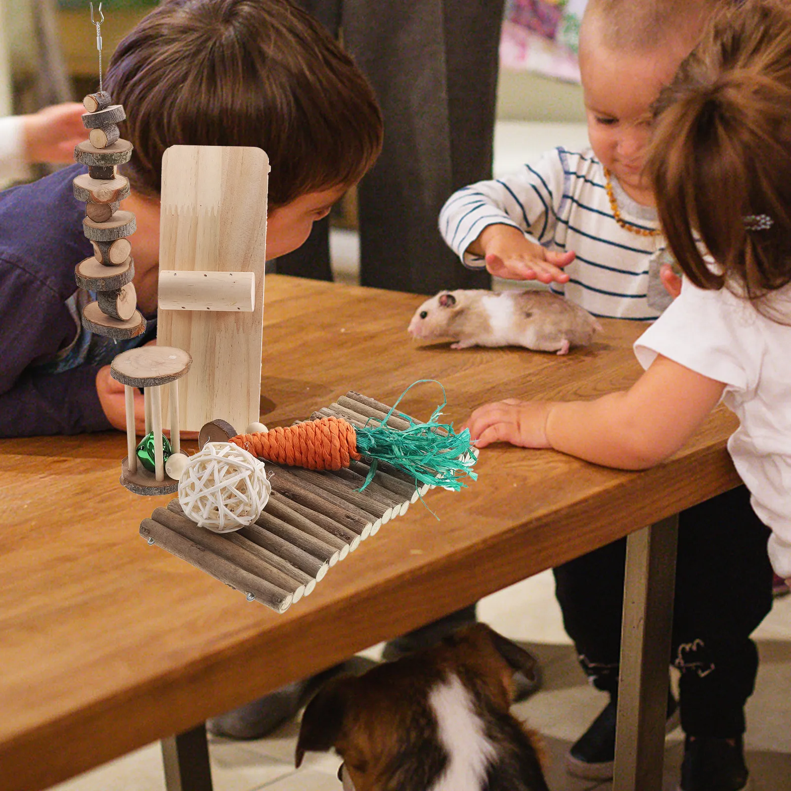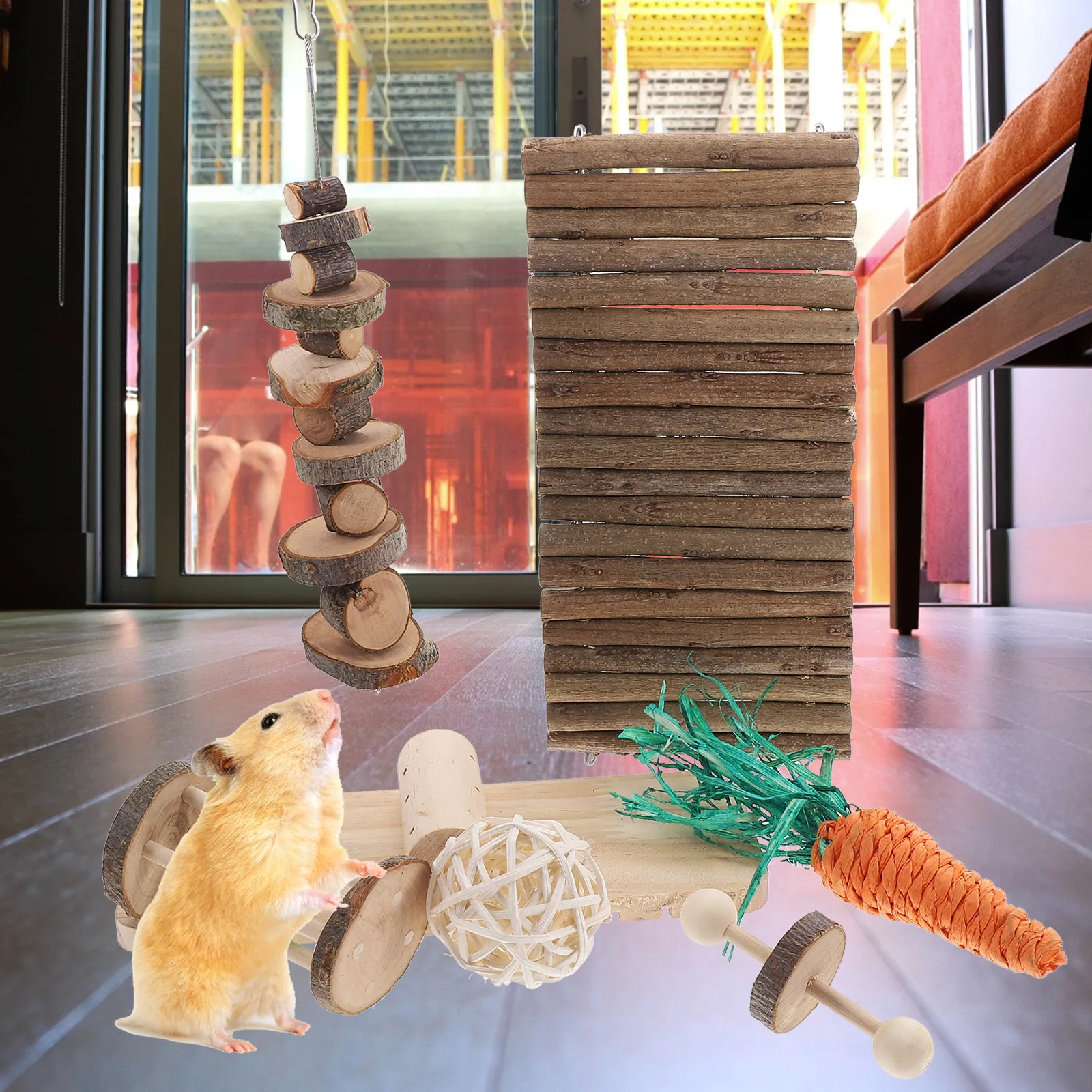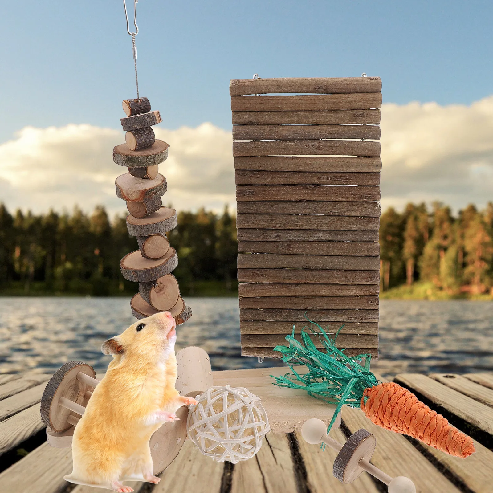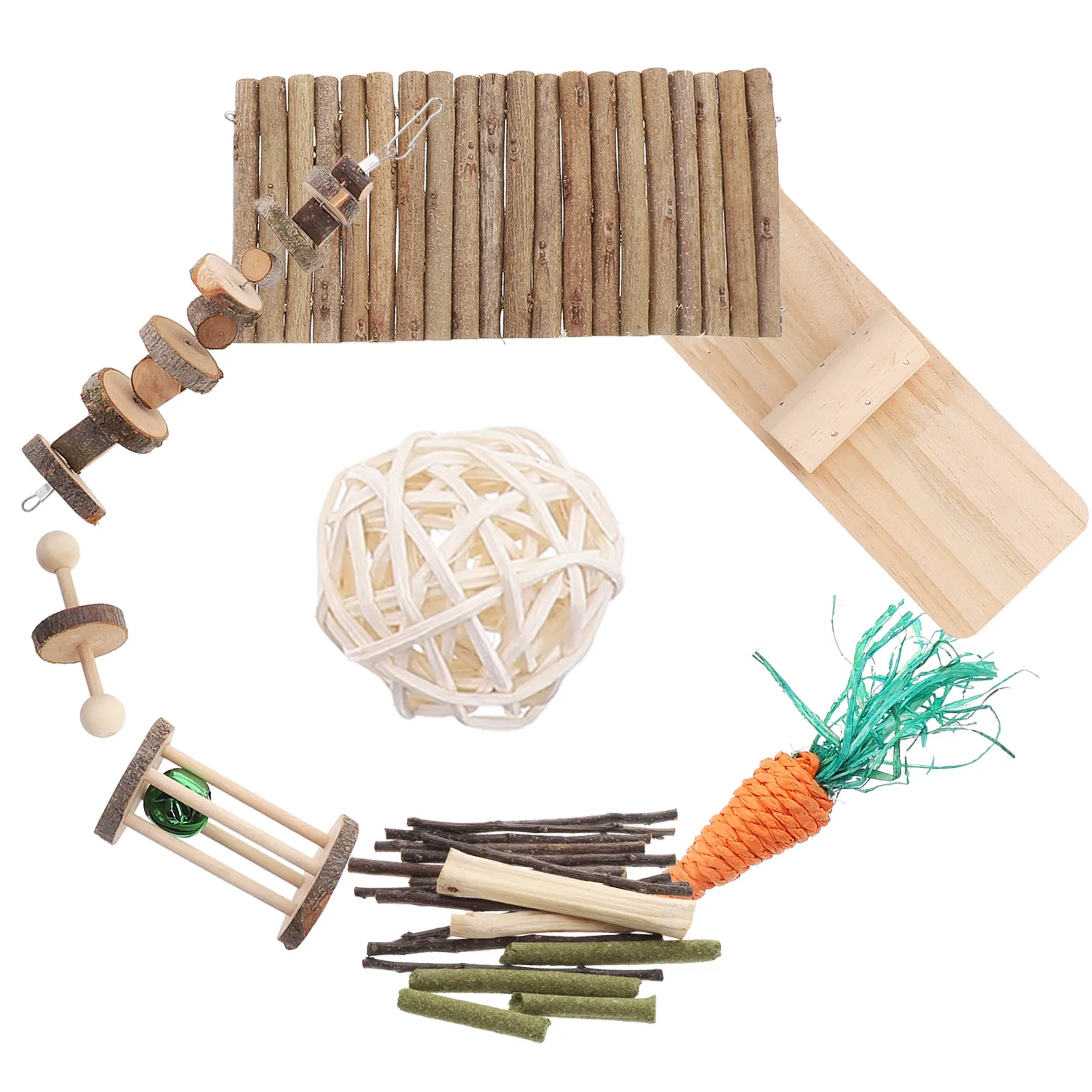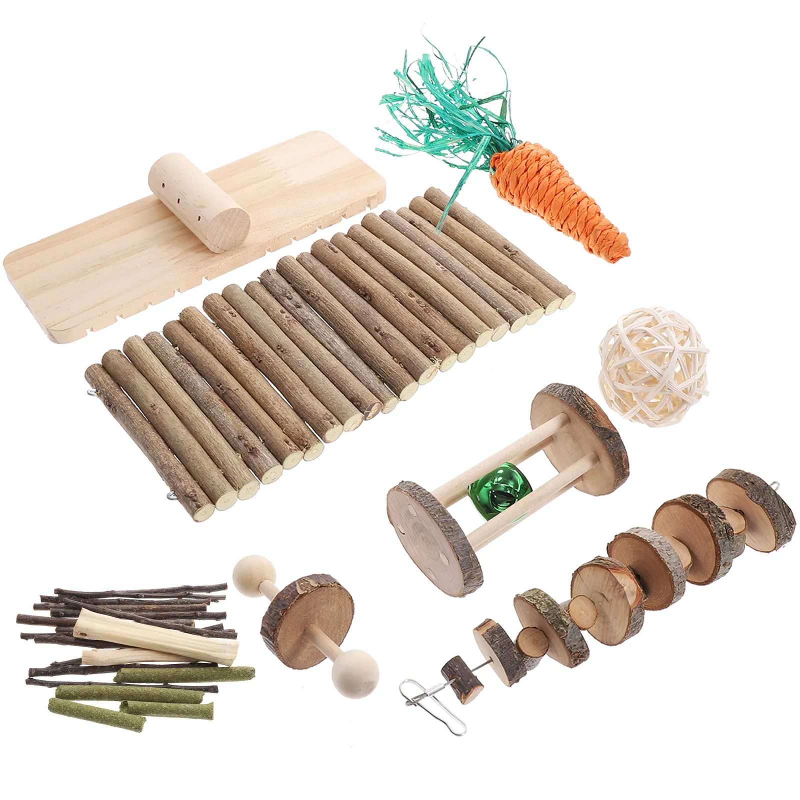 A hamster chewing set, made of wood; safe to chew and play with, help with teeth grinding, improve digestion, and increase appetite. Ideal for small animals such as hamsters, guinea pigs, gerbils, mice, hamsters and other . bunny