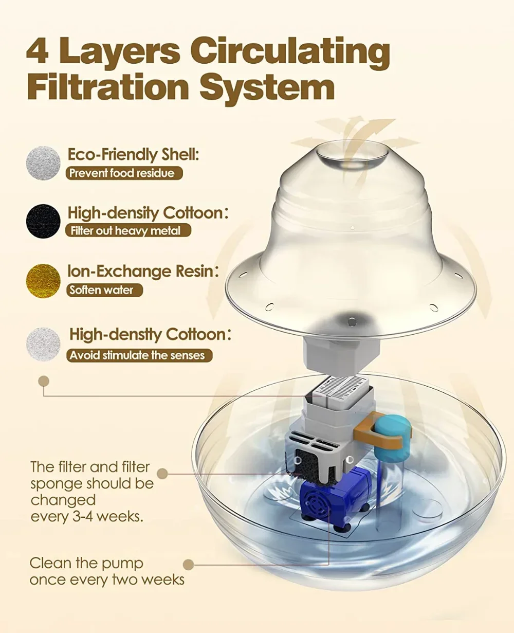 5. Easy to Set Up and Clean: cat water dispenser is easy to assemble and disassemble for cleaning and replacement. For your pets health, it's recommended to change the filters, clean the pump and fountain every 2 weeks.