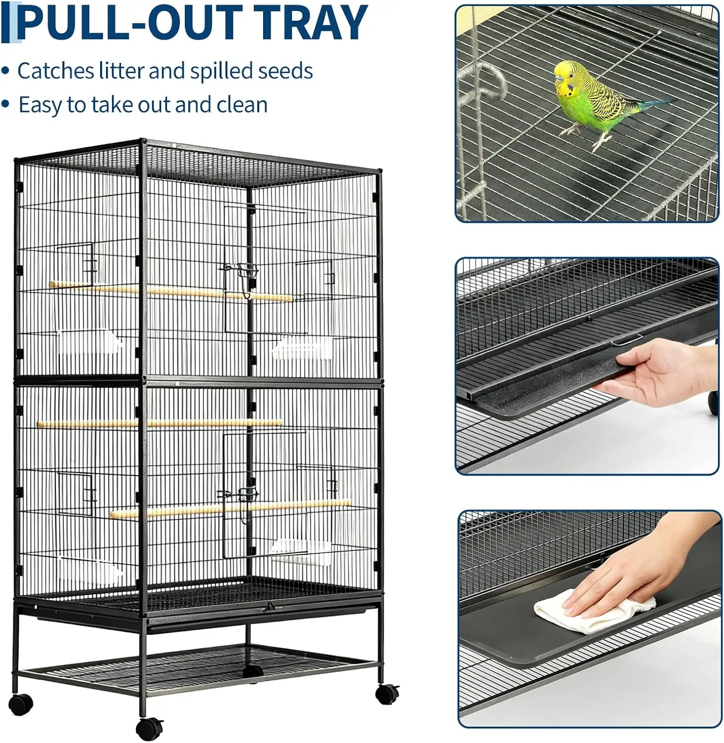 –Easy to Clean & Maintain: A removable plastic tray and mesh bottom grid make cleaning quick and simple. The metal grid can prevent the birds from stepping on food waste, droppings, or other debris that might accumulate at the bottom. This keeps their feet healthy.