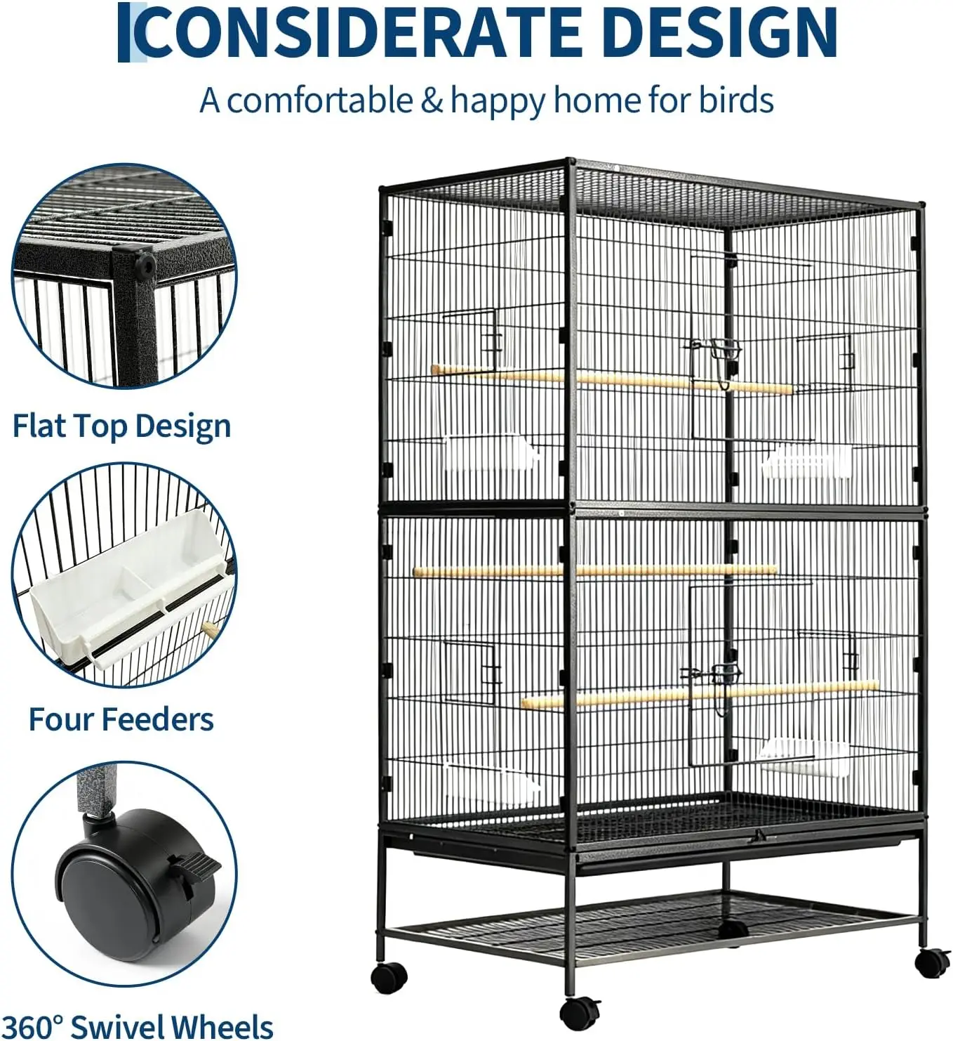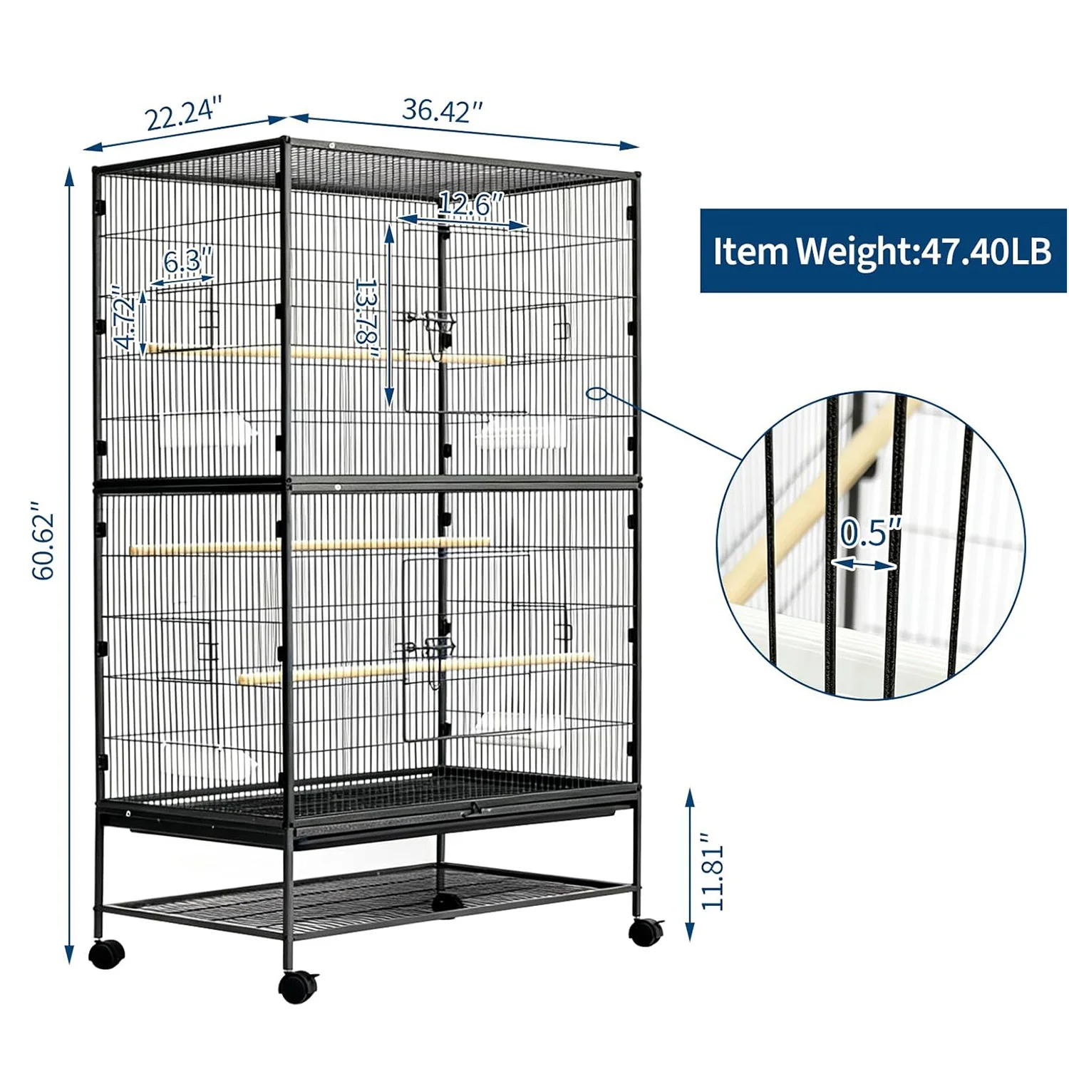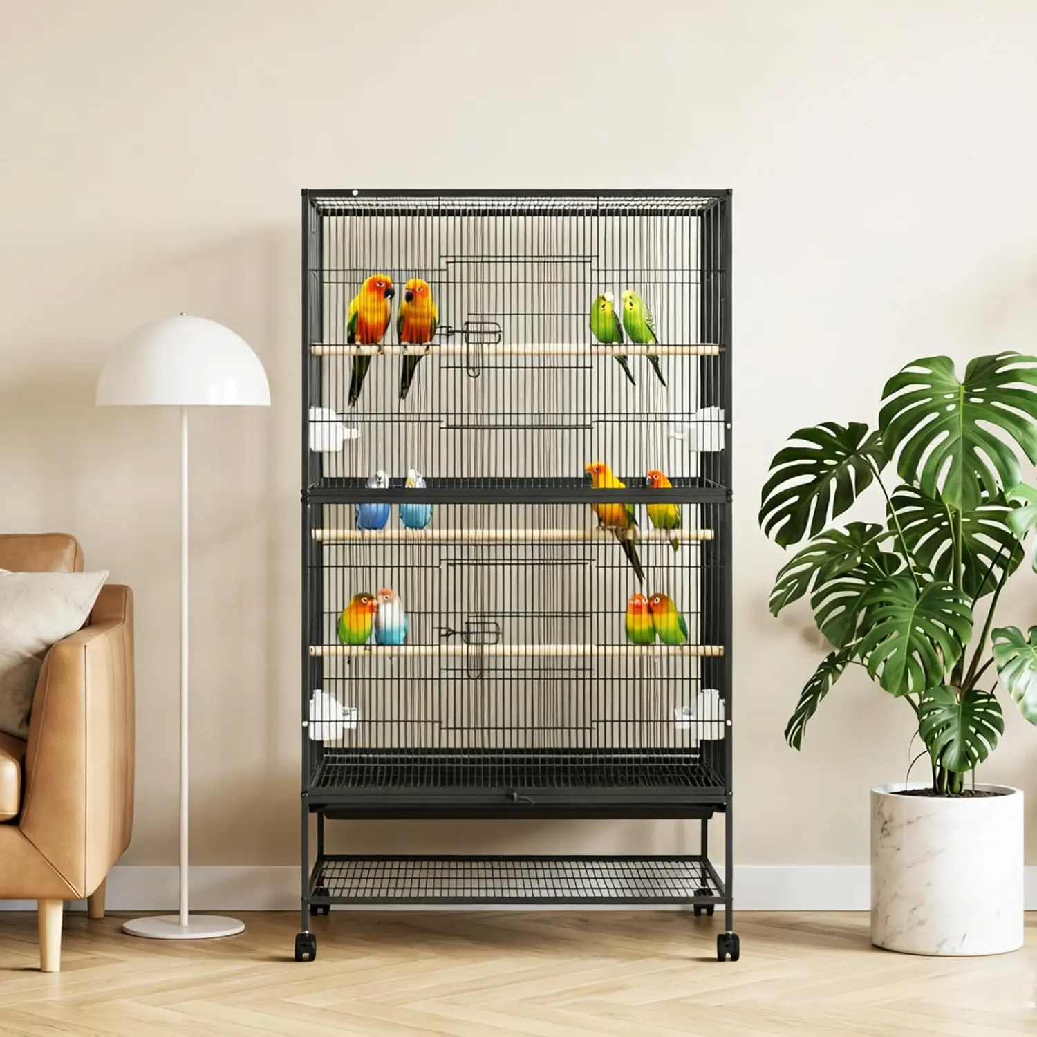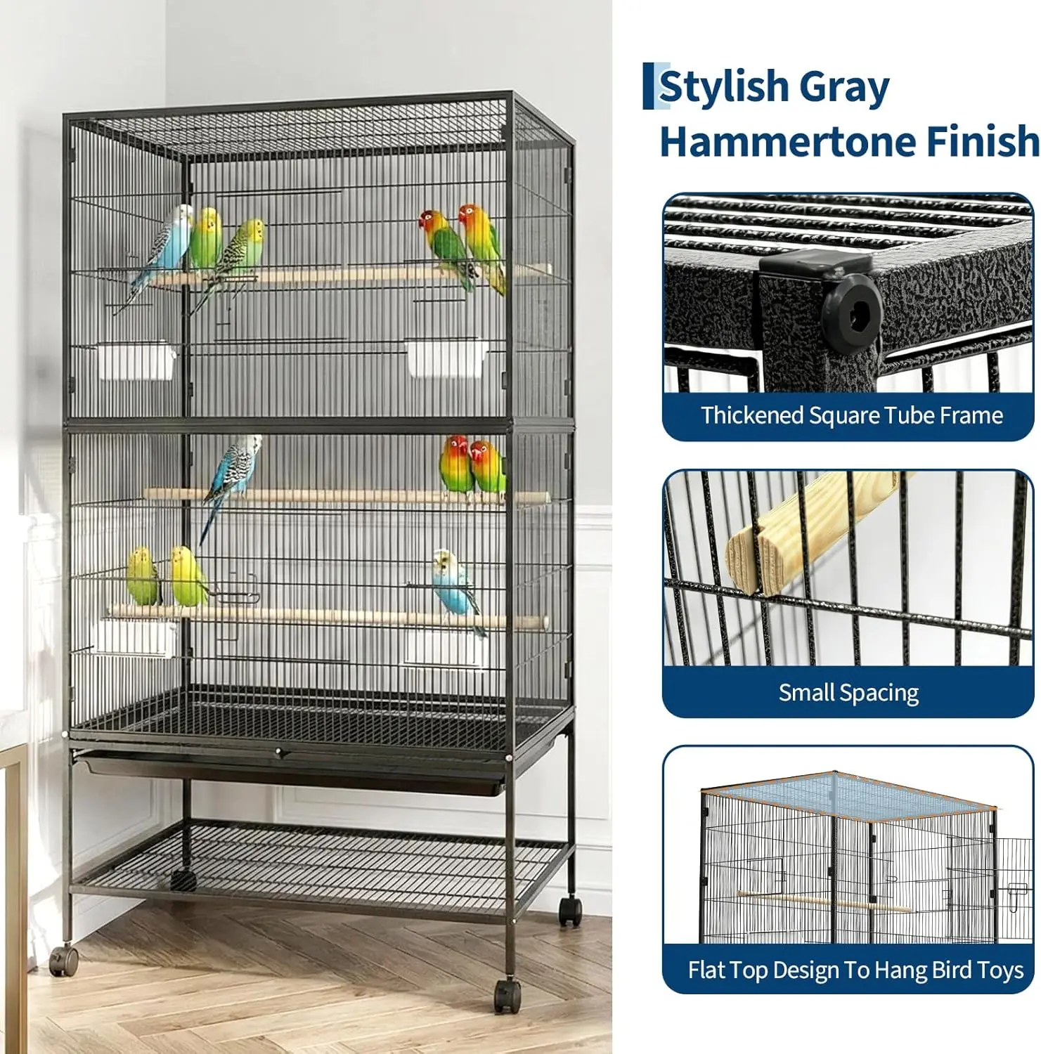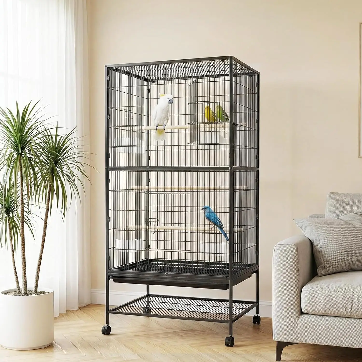 –Extra Large Bird Cage: The 61" H large bird cage offers generous space for your feathered friends. The 36" width allows large birds to easily spread their wings, while the height provides space for climbing, play, exploring, and vertical movement.