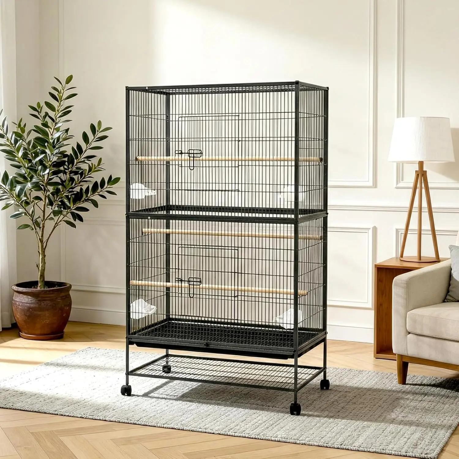 –Mobile & Versatile for Any Setting: The casters make it easy to move the cage around, so you can change the bird's environment or clean the cage area without heavy lifting.The lower storage rack can be used to store bird food, hygiene products, etc., and it is easier to put them back in place after each use, keeping the space tidy.