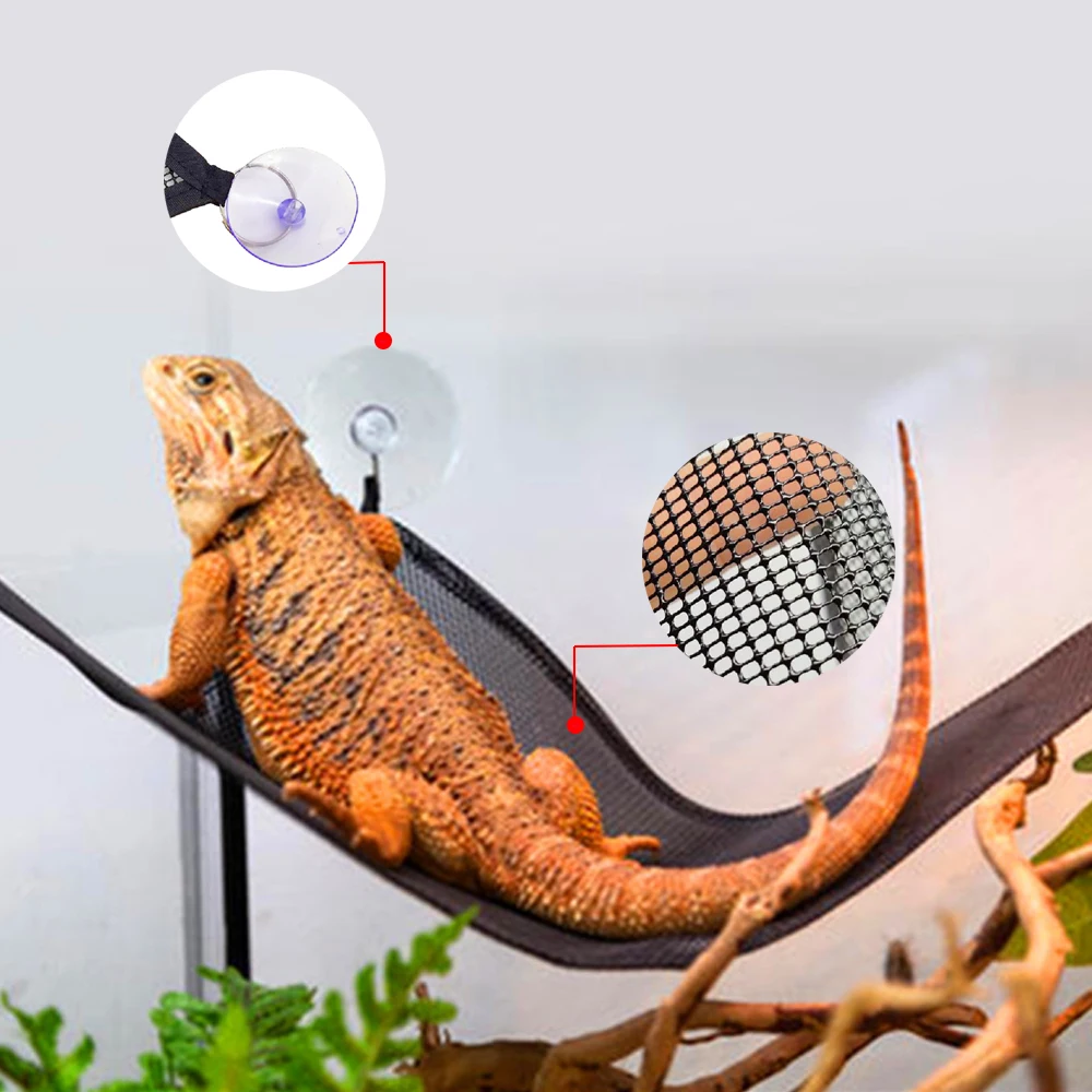 Our lizard hammock is made of breathable mesh and durable nylon structure. Equipped with 3 powerful suction cups and metal rings to help secure the reptile hammock to the water tank.