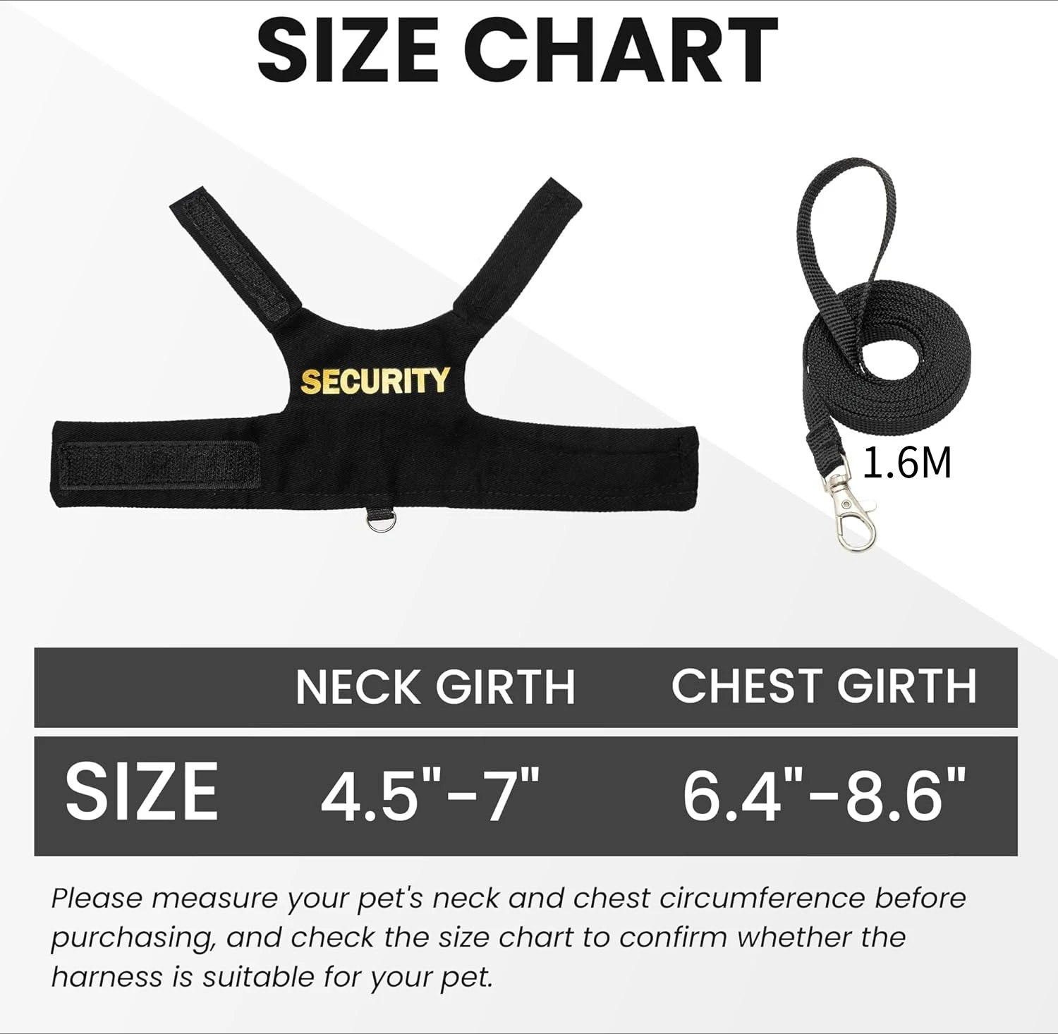 - Harness and Leash Size: This harness is suitable for small animal with neck circumference: 4.5"-7" and chest circumference: 6.4"-8.6". In addition, this harness also comes with a 5ft short leash, which is suitable for use when walking outdoors.