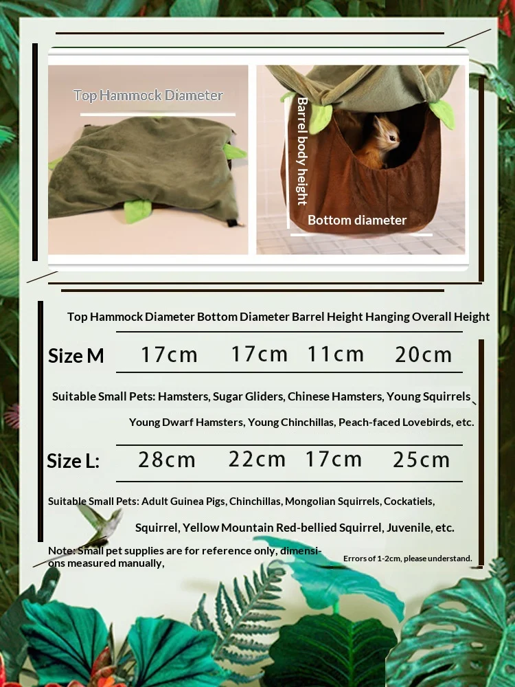 Product size: M: Top hammock diameter: 17cm, bottom diameter: 17cm, barrel height: 11cm, overall suspension height: 20cm
