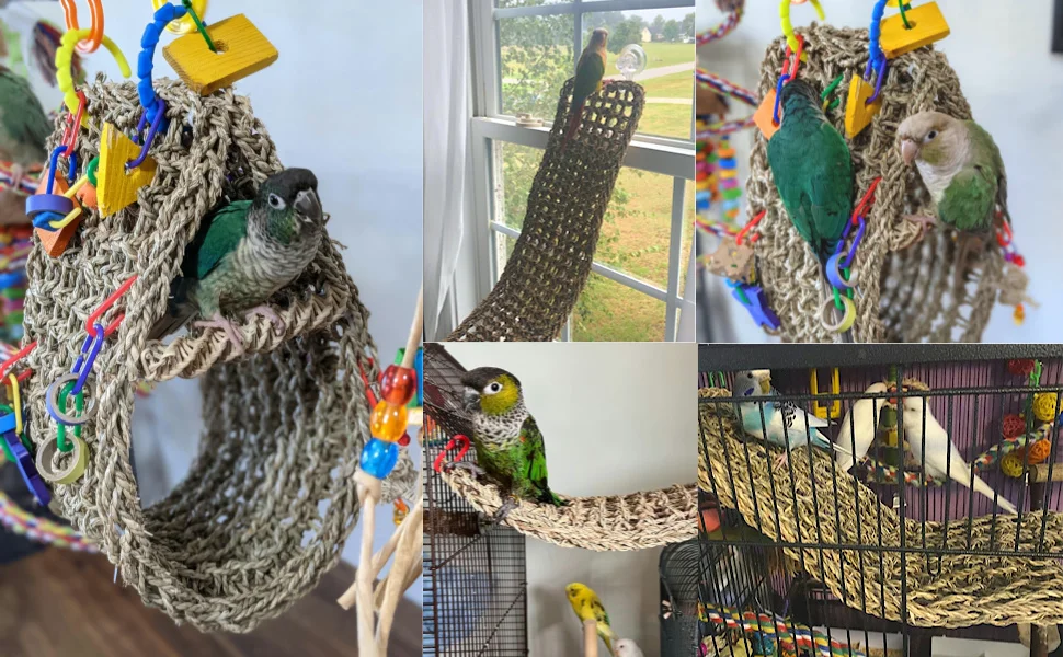 Optimize your birds’ activity & Wild space, these toys will expand your pet cage entertainment area and provide a natural habitat.Parrots roost, walk, chew, or rest and forage on seagrass mats.Perfect chew toy, great for a hammock that hangs from the top or a climbing wall.