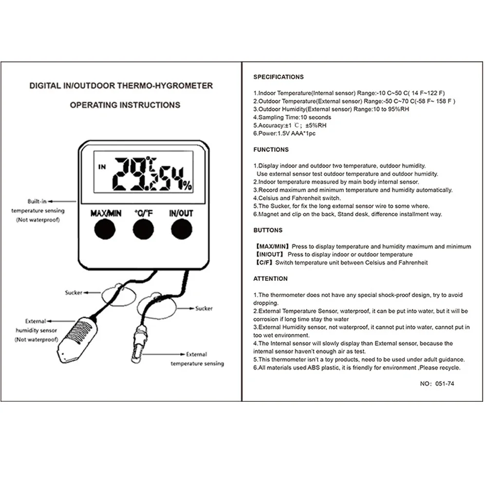 – This electronic thermometer and hygrometer can measure internal temperature ranging from -10℃~50°C and external temperature form -50~70°C. The upgraded probe every 10 seconds measures temperature once for high accurate measurement.