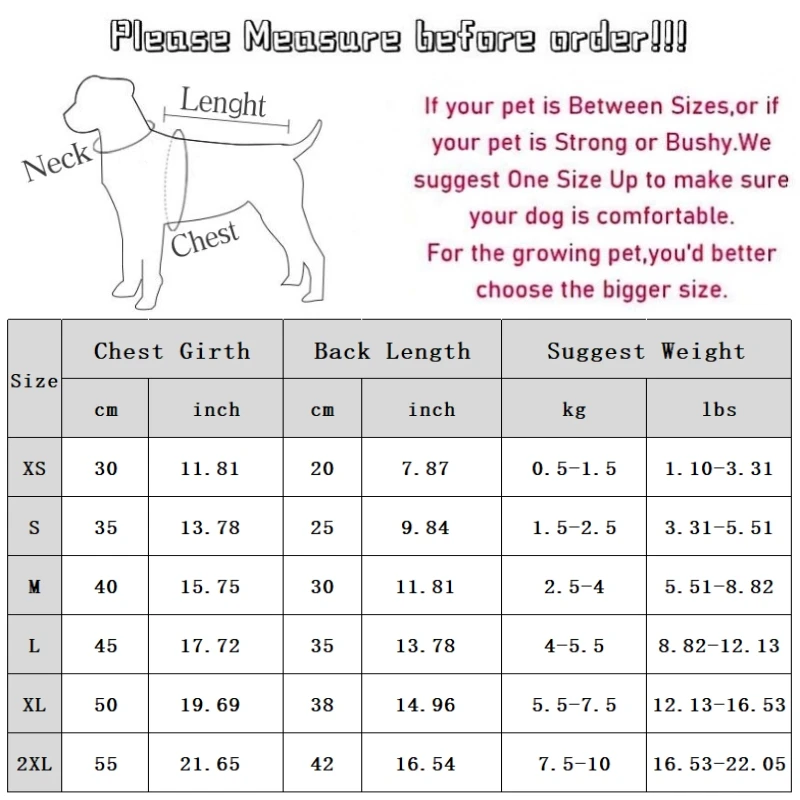 XXL: Chest 57cm/22.44'' ; Length 42cm/16.53'' ; Suitable weight 7.5-10kg/16.53-22.04ib