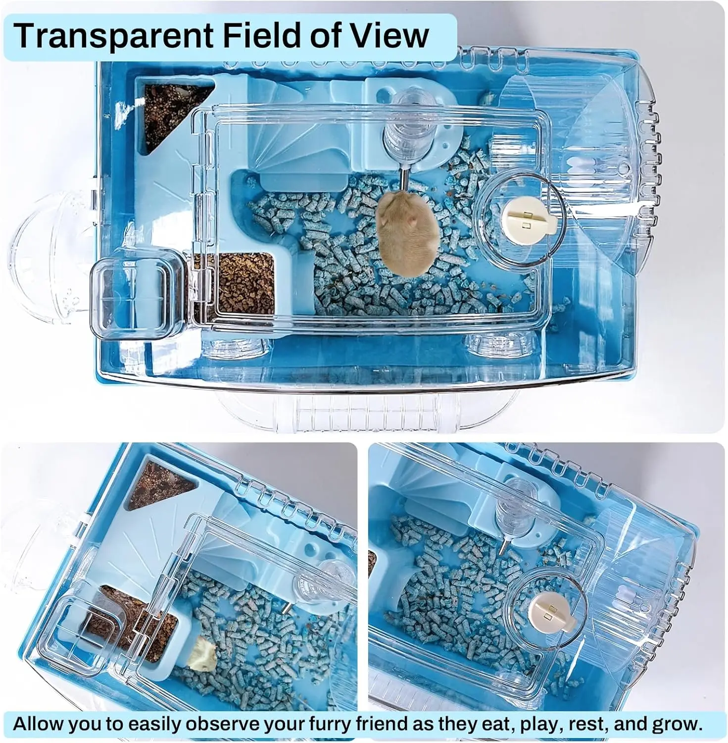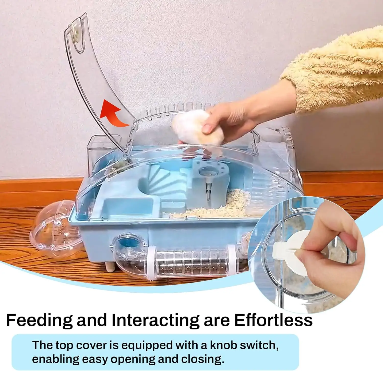 【Transparent Field of View】 The hamster cage features a top made of acrylic material, allowing you to easily observe your furry friend as they eat, play, rest, and grow. The convenient top door of this dwarf hamster cage enables interaction and bonding moments with your hamster.