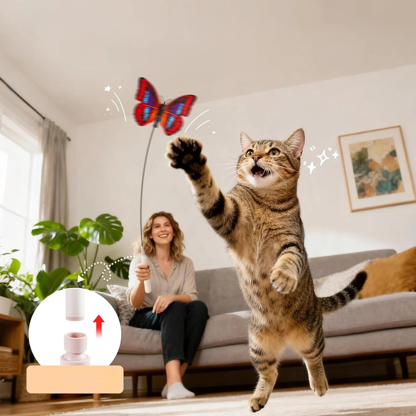 Features: 1.Stimulate Your Cat’s Hunting Instinct: Transform ordinary playtime into an exciting adventure with this interactive cat toy, designed to keep your feline energetic and engaged for hours. Watch boredom fade as you and your pet bond during every session. 2.Boost Wellbeing & Health: Regular use of this electric butterfly toy encourages exercise, stretching, and natural hunting activities. Your cat stays healthy and less stressed, enjoying better rest at night and increased confidence with every joyful leap. 3.Realistic Play Experience: The flutter bug cat toy features fluttering feathers that mimic unpredictable prey movements, sustaining your cat’s curiosity. Sturdy and safe, it offers independent entertainment even when you’re busy. 4.Sturdy Materials for Lasting Fun: Made from high-quality ABS and tough wire, the flutter rotating kitten toy is engineered to resist biting and scratching. Its sturdy spring design withstands enthusiastic pulling, ensuring lasting enjoyment. 5.Two Engaging Modes: Choose from two automatic cat teaser toy modes – one for 5 minutes of continuous play or one with alternating bursts of vibration. Sleep mode conserves energy, while touch or a button brings instant fun. Specification:
