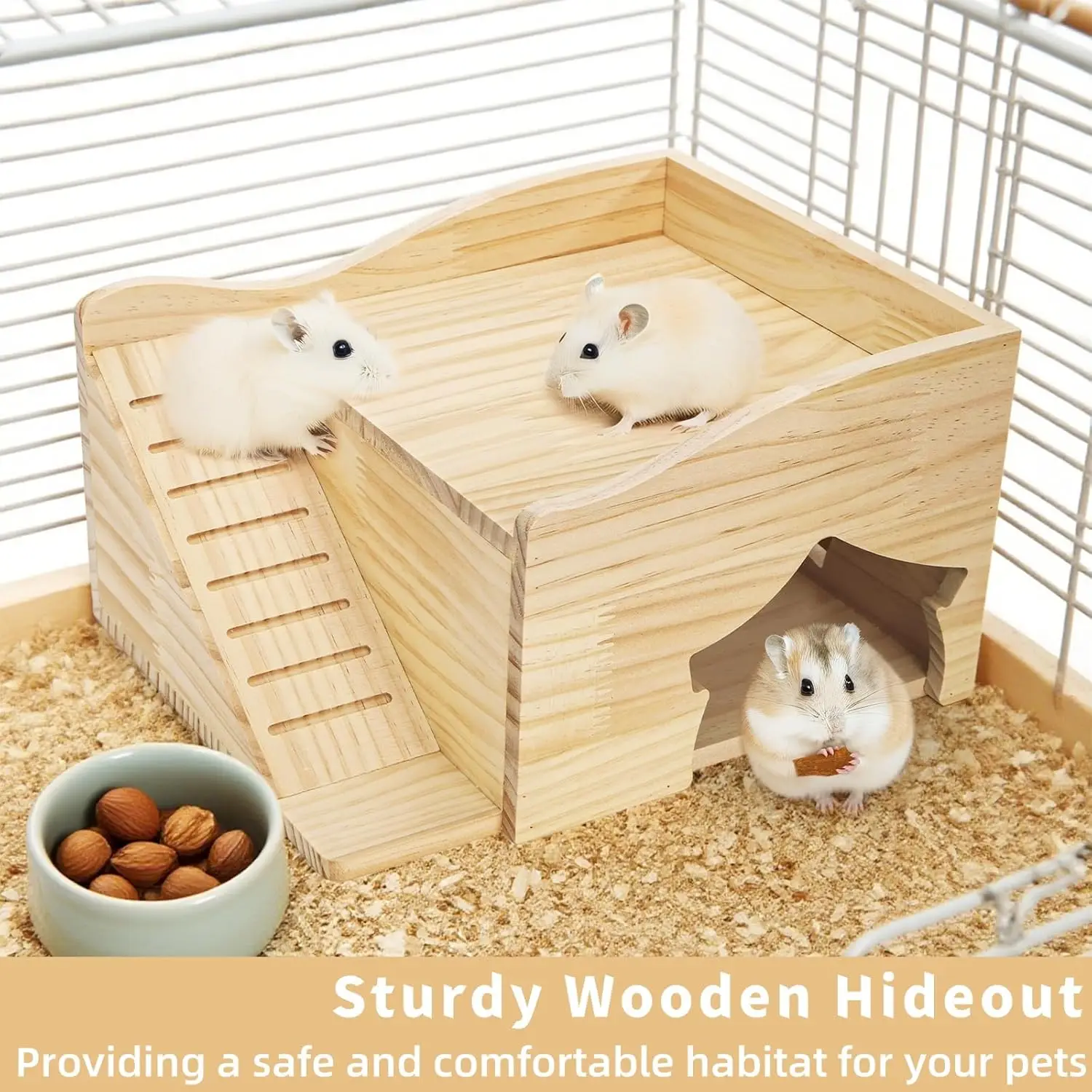 Durable Wooden Material: Made from natural wood, this hamster house provides a durable and sturdy habitat for small rats. The smooth edges and compact construction ensure a safe environment for tiny animals.