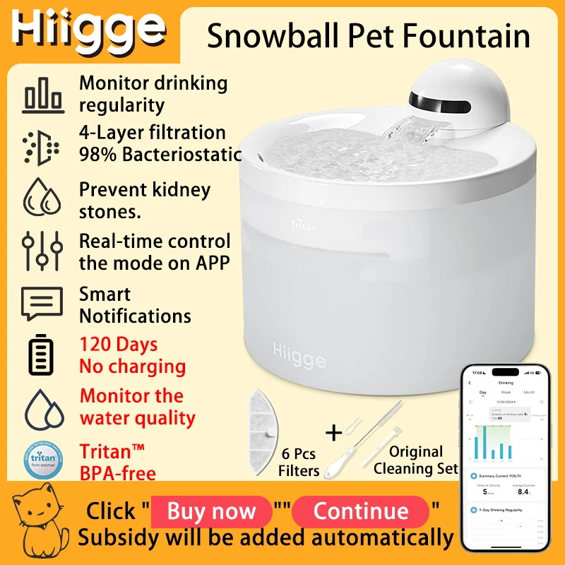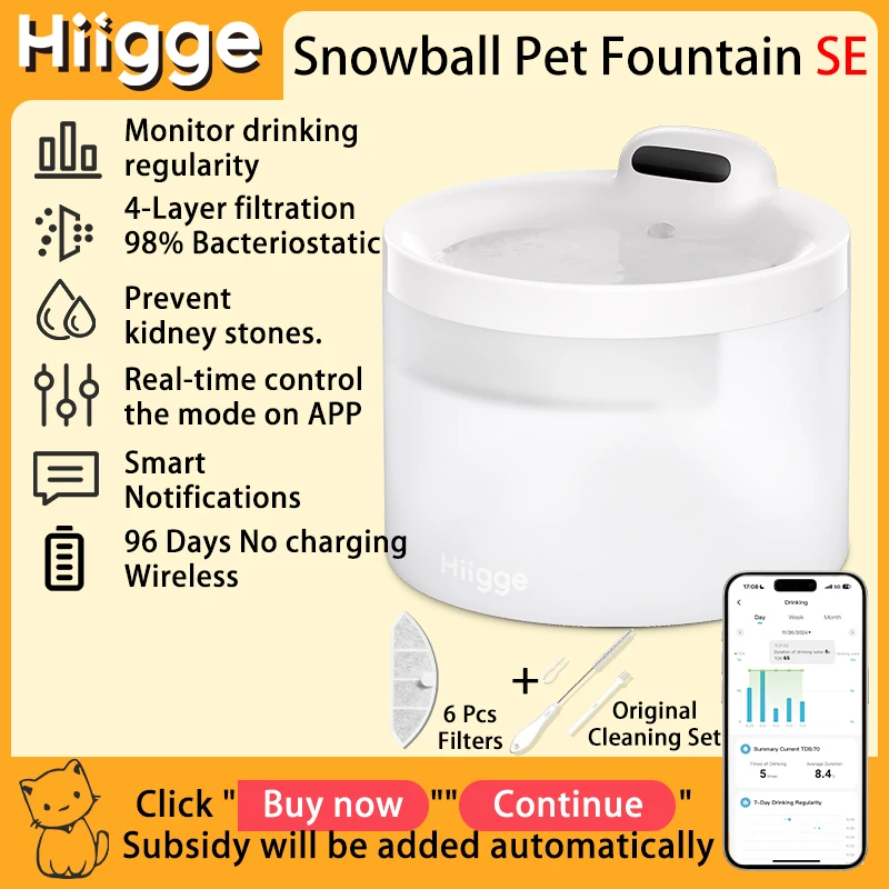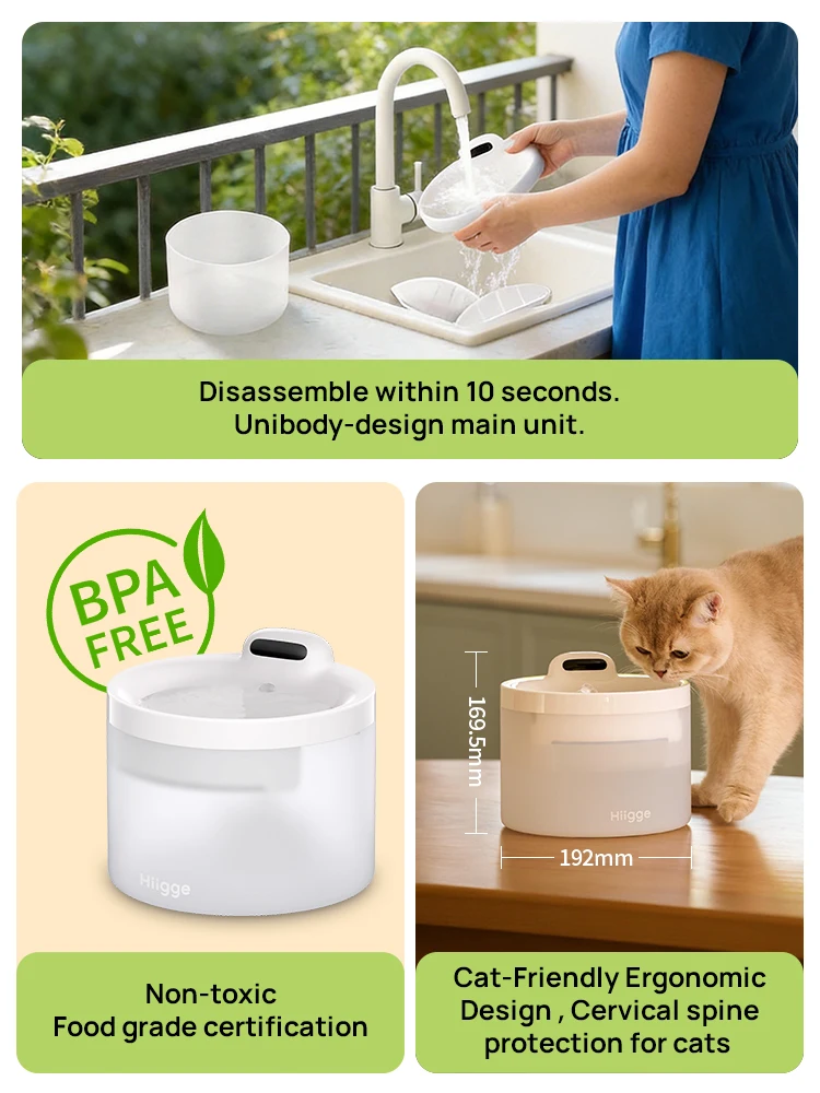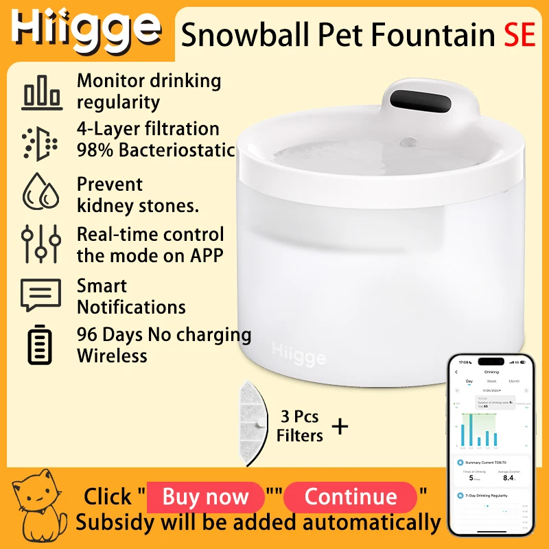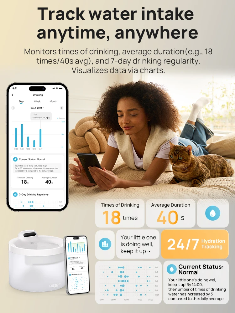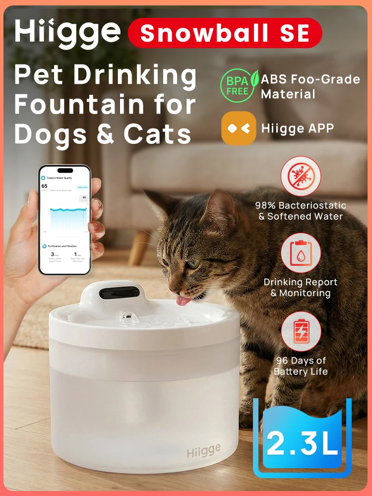 Hiigge Cat Water Fountain SE, 70mai Petsafe Wireless Automatic Drinker for Dog, Cordless Water Dispenser with data analysis