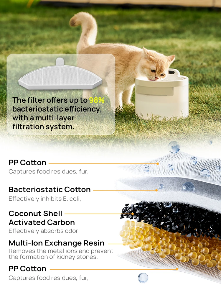 The filter effectively removes saliva, fur, and debris, while providing up to 98% bacteriostatic efficiency to reduce common bacteria and ensure your cat always drinks pure, hygienic water.