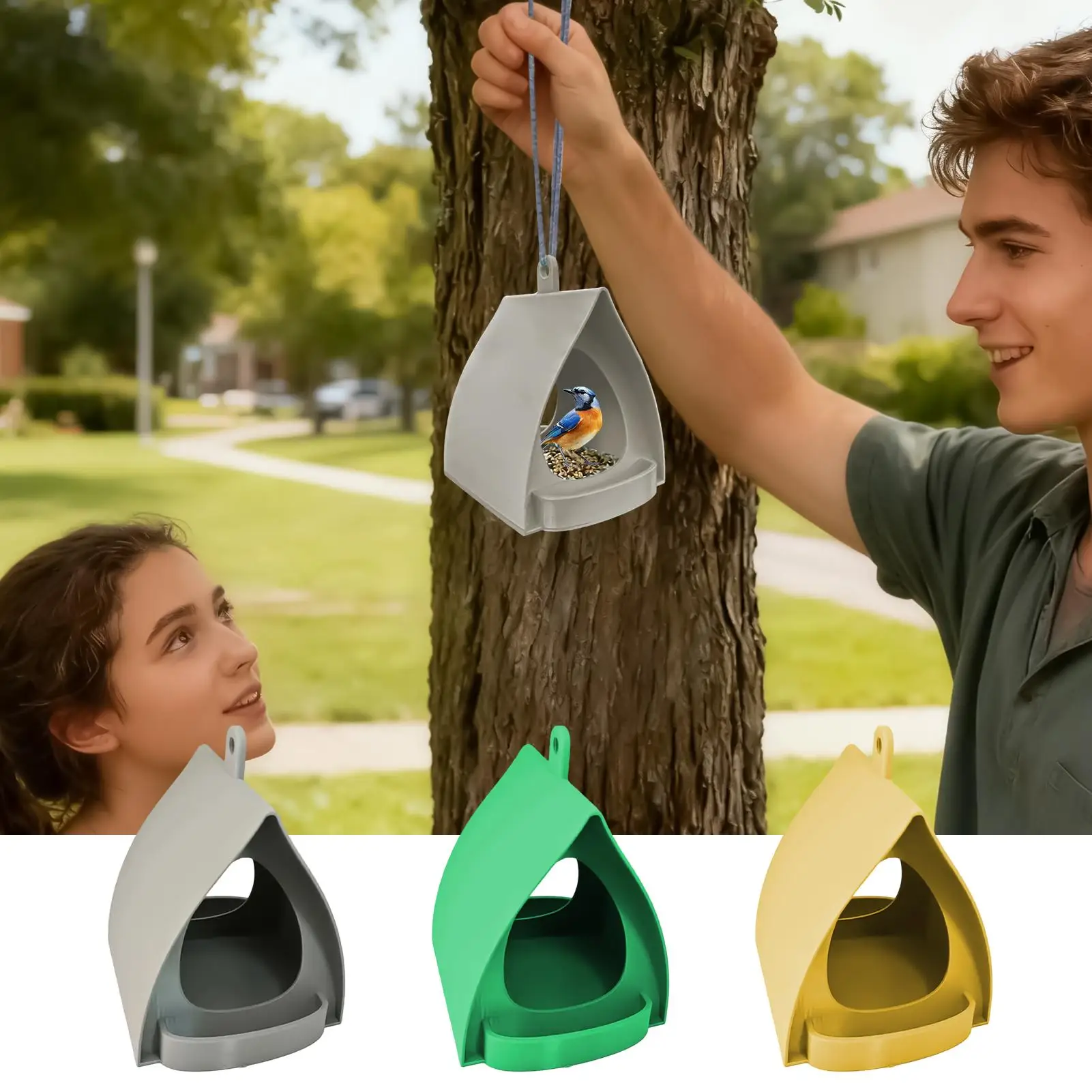 3.Rain-Proof: The bird feeder house incorporates an arched roof with excellent drainage properties, allowing the rain-proof cover to shield food from rain and humidity, thereby keeping it dry and clean while avoiding spoilage, perfect for year-round use in gardens or backyards
