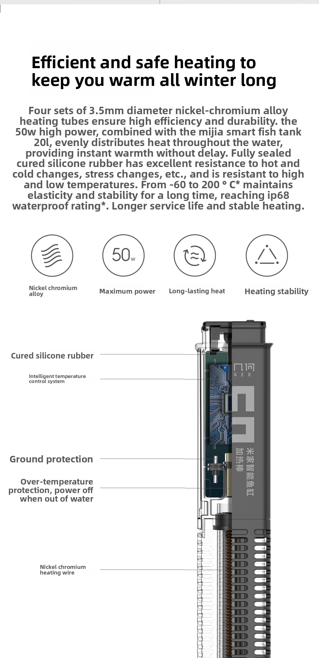 Mjia DESGEO 50W Smart Aquarium Heater – APP Control, Intelligent Constant Temperature Precise Thermostat for Fish Tanks