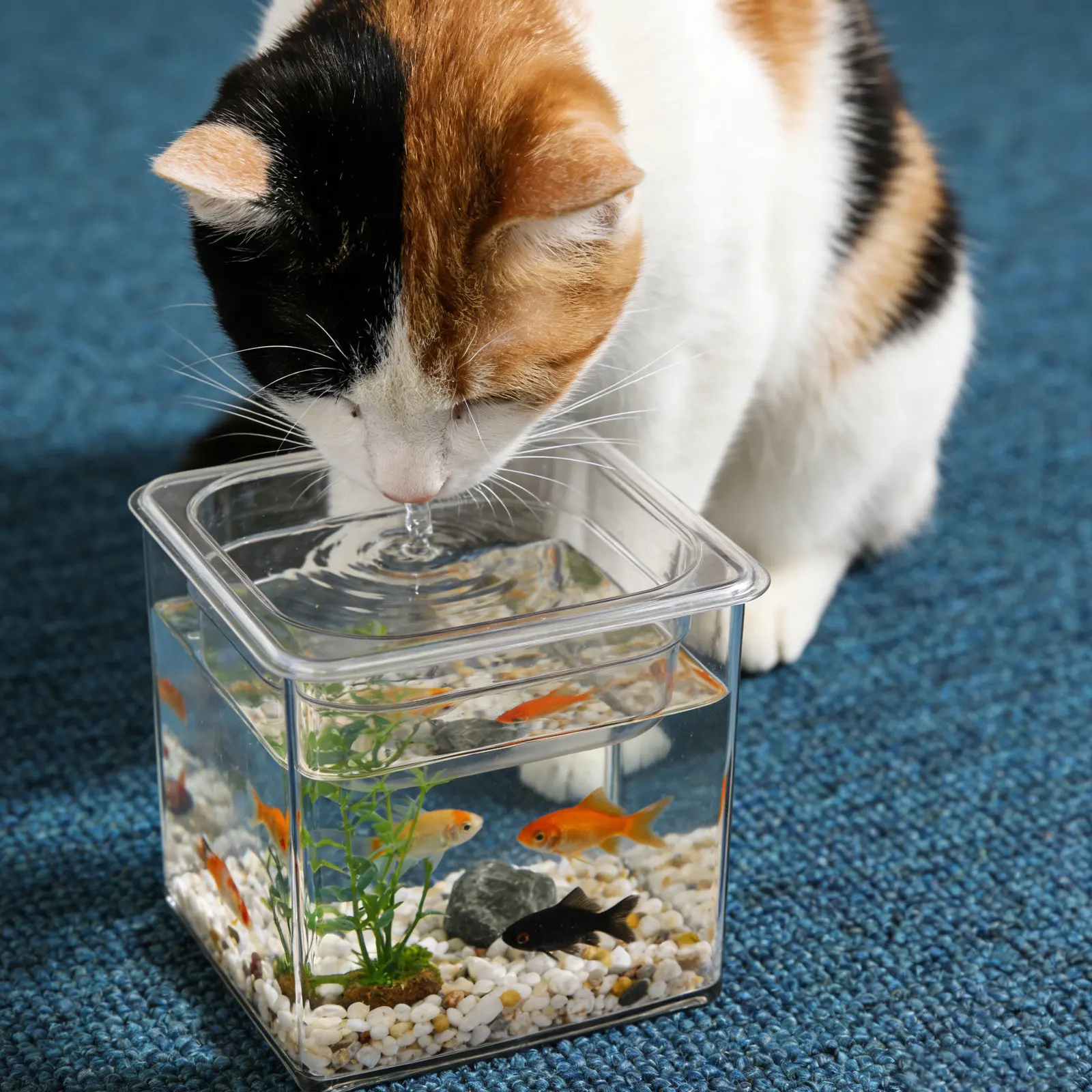 This fish bowl combines a cat waterer fountain with a stylish fish tank aquarium, providing a drinking solution for multi-cat households. The unique office desk fish tank design encourages cats to drink while enhancing home, and its operation ensures a peaceful living environment.