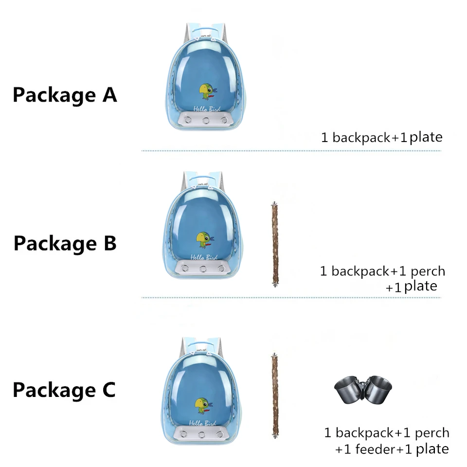 Package B include:1 bird backpack + 1 tray + 1 perch .