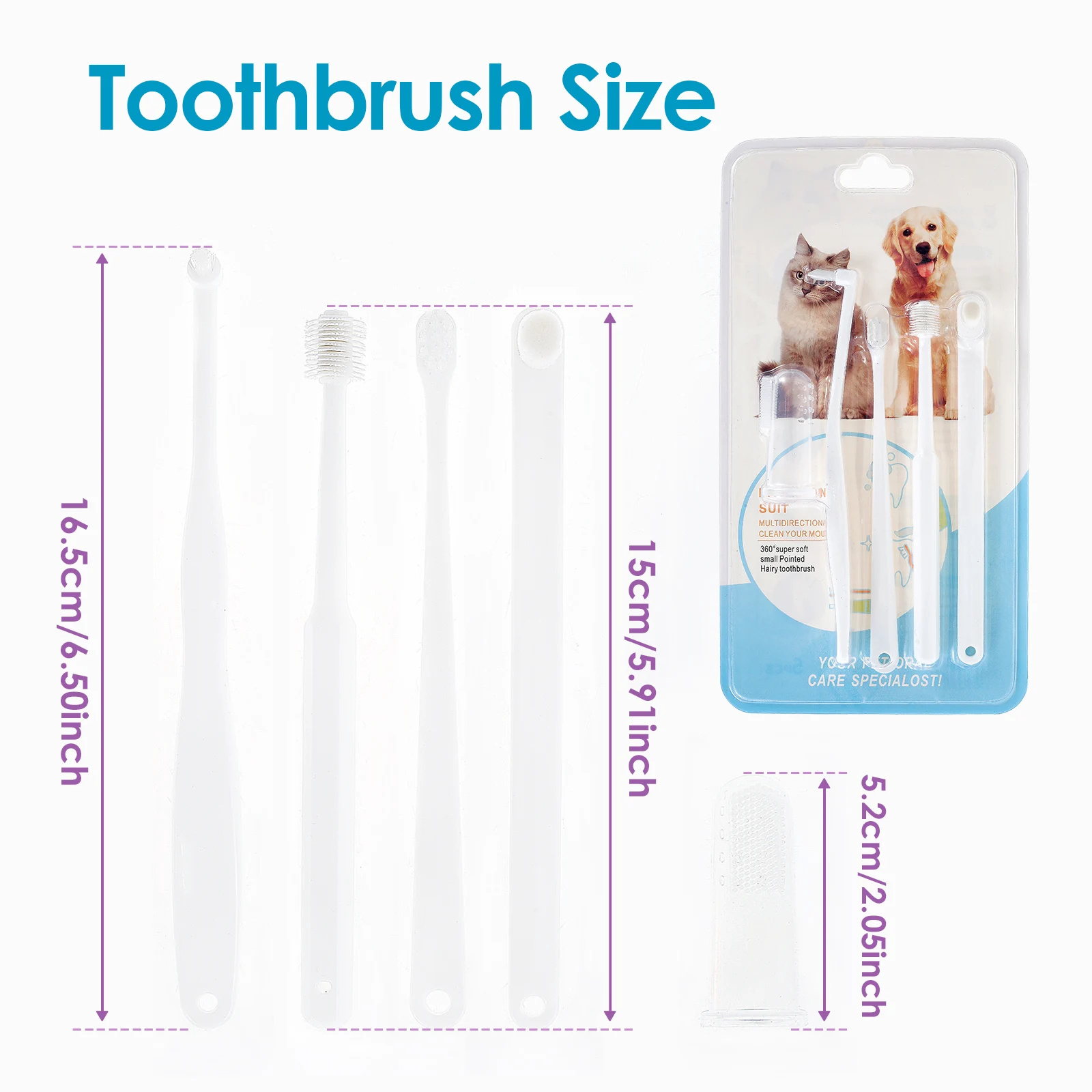 Equipped with Toothbrush: The set includes various kinds of toothbrushes, including pointed toothbrush, DuPont toothbrush, multi bristle toothbrush, 360 degree rotating toothbrush and finger toothbrush. These brushes can be used to clean your pet's teeth from all angles after eating