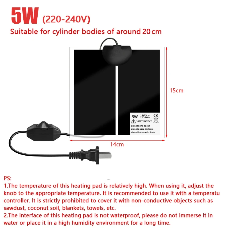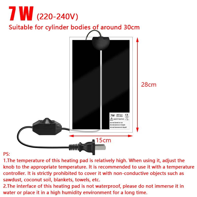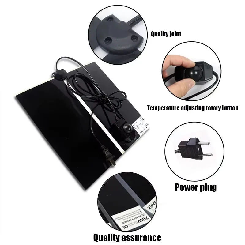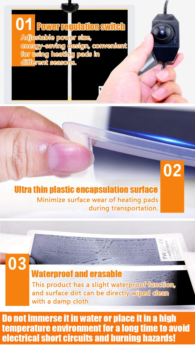 2.The temperature of this heating pad is relatively high. When using it, adjust the knob to the appropriate temperature. It is recommended to use it with a temperature controller. It is strictly prohibited to cover it with non-conductive objects such as sawdust, coconut soil, blankets, towels, etc.