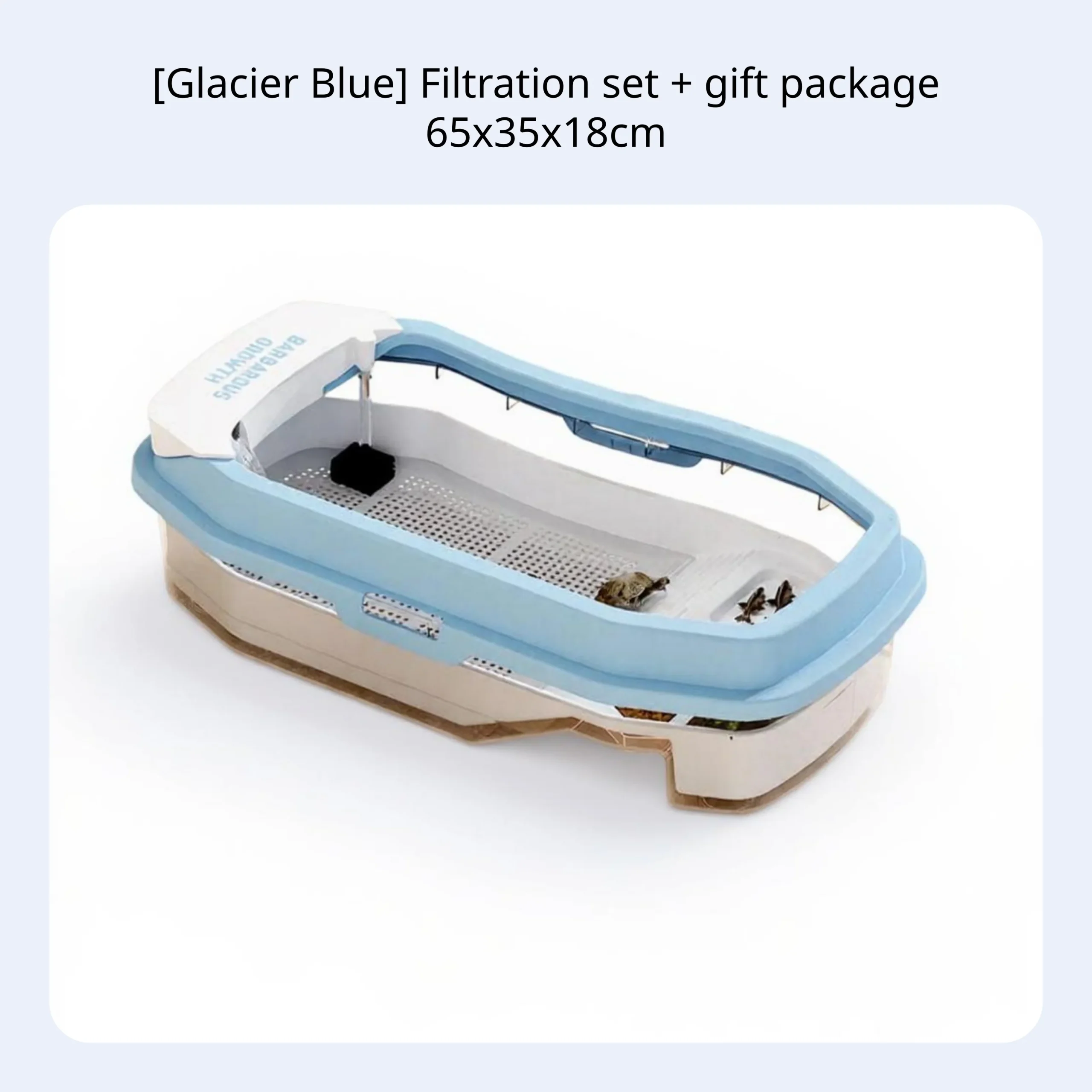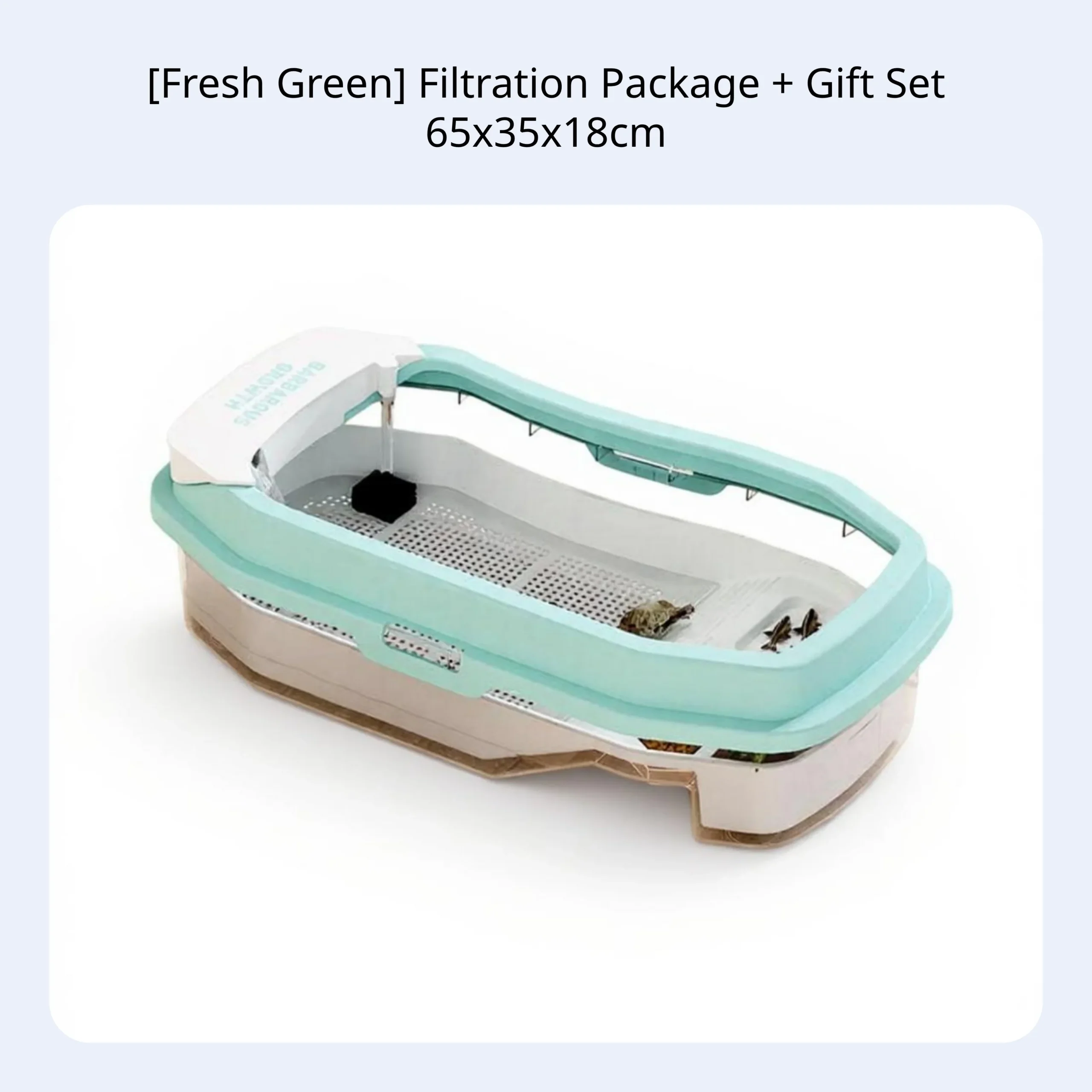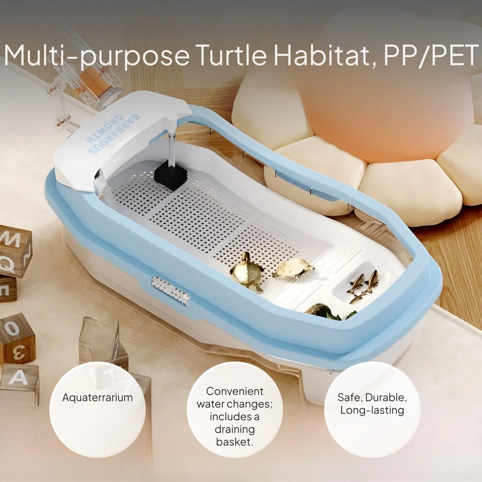 Create a natural habitat for turtles or reptiles with this spacious terrarium, featuring a basking platform, built-in filtration, and smart partitions for comfort at home or office. Made from durable, safe PP/PET material for long-lasting use and pet safety. Easy water changes and cleaning with a detachable design and drainage basket. The inward lid prevents escapes for worry-free use. Includes filtration box, pump, purifier cotton, decorative stones, turtle food, fish mesh, artificial foliage, and ornaments—ideal for beginners and educational observation.
