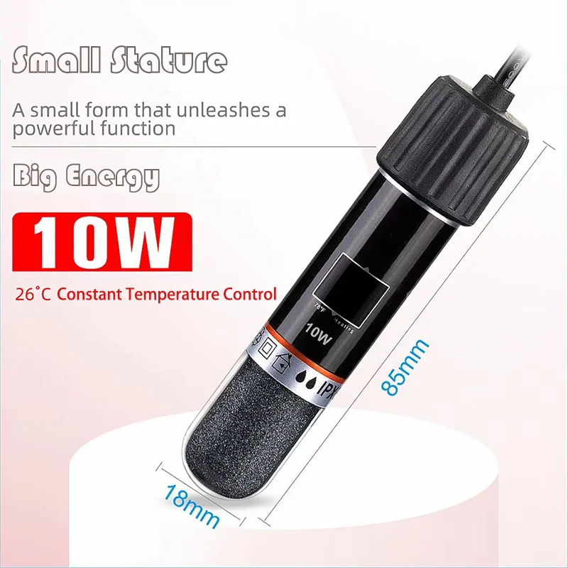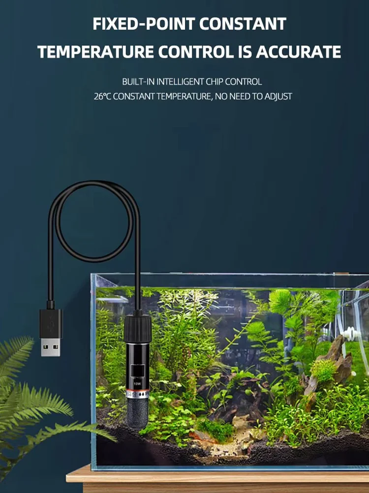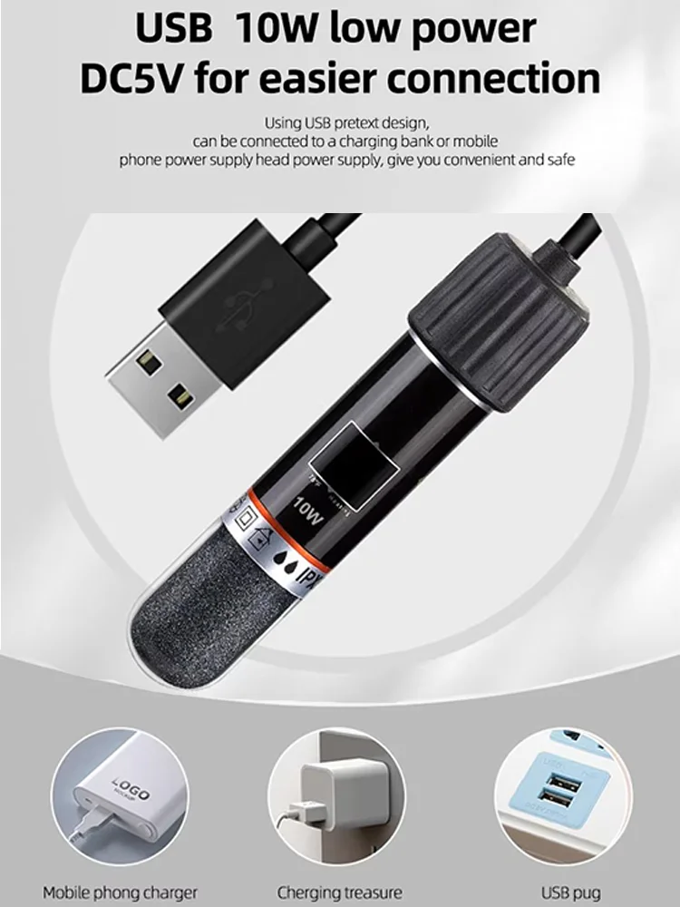 This 10W Mini USB Aquarium Heater! Compact (85mm×18mm) but powerful, it uses smart water-sensing tech to prevent dry burning and auto-stops at 27°C for overheat protection.