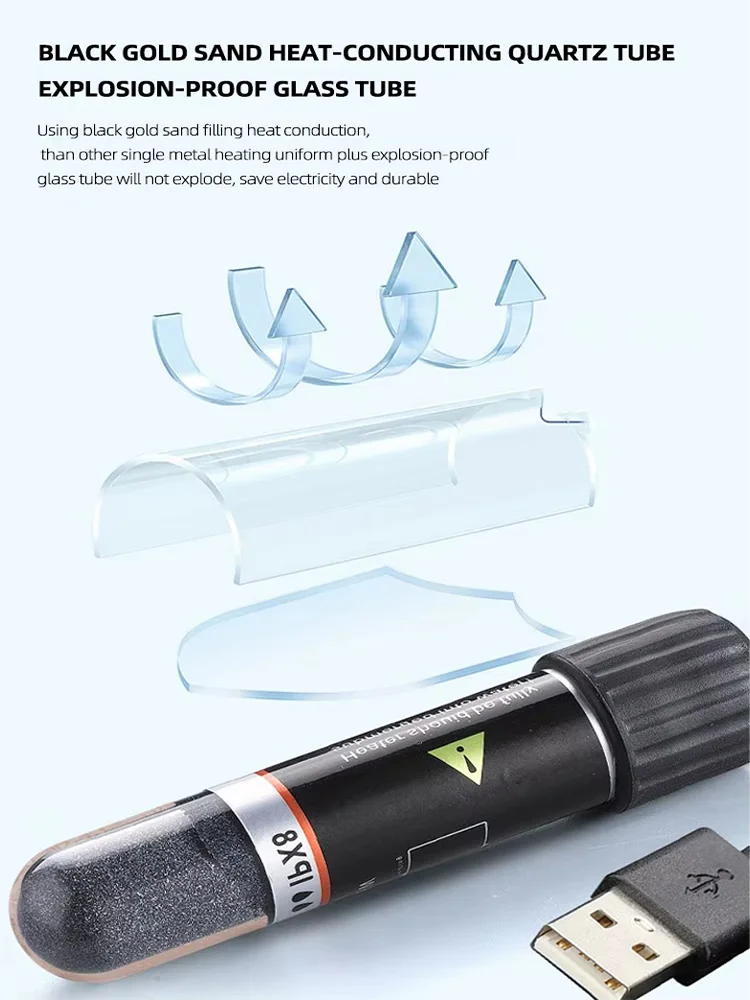 Its explosion-proof glass tube and USB-powered design (works with chargers, power banks) make it safe, convenient, and durable.