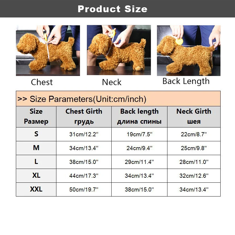 2.Measuring Your Dog for a Perfect Fit! Your baby usually wears size XXL doesn’t mean all size XXL will fit him/her. Different designers and manufacturers use their own size charts. So don’t buy a particular size, Please measure your dog’s chest girth and back length according to our guide before buying, We recommend that you can buy a bigger one size for your dogs.( or refer to our customers’ shopping experience)